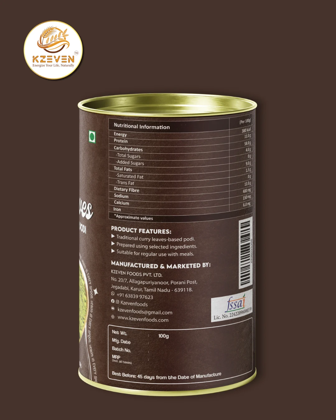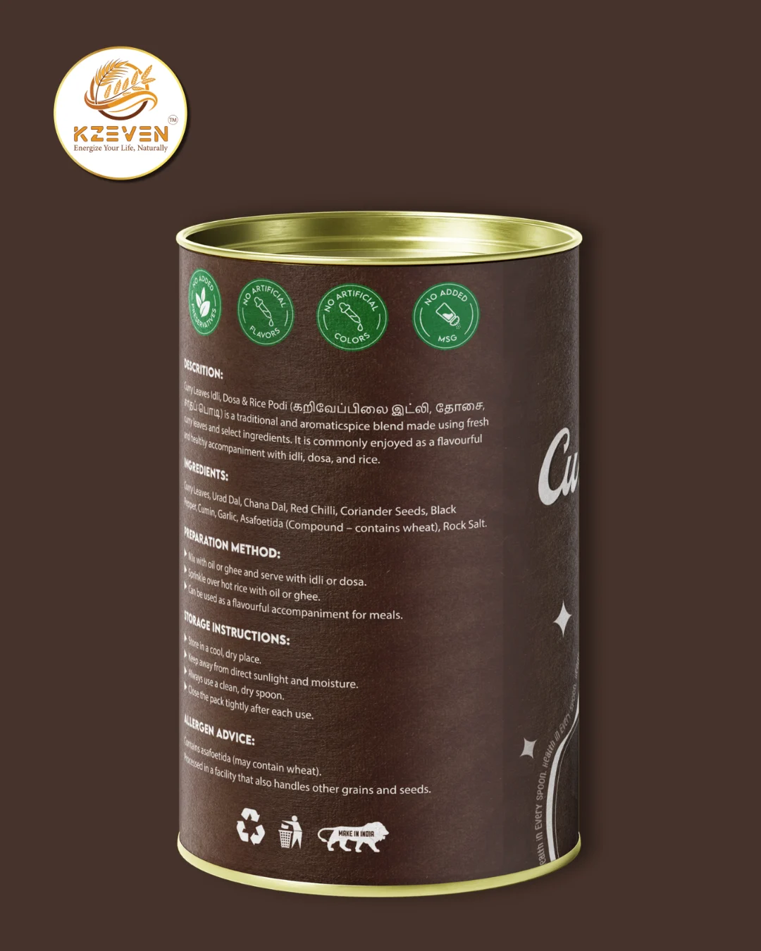 Curry Leaves, Urad Dal, Chana Dal, Red Chilli, Coriander Seeds, Black Pepper, Cumin, Garlic, Asafoetida (Compound – contains wheat), Rock Salt.