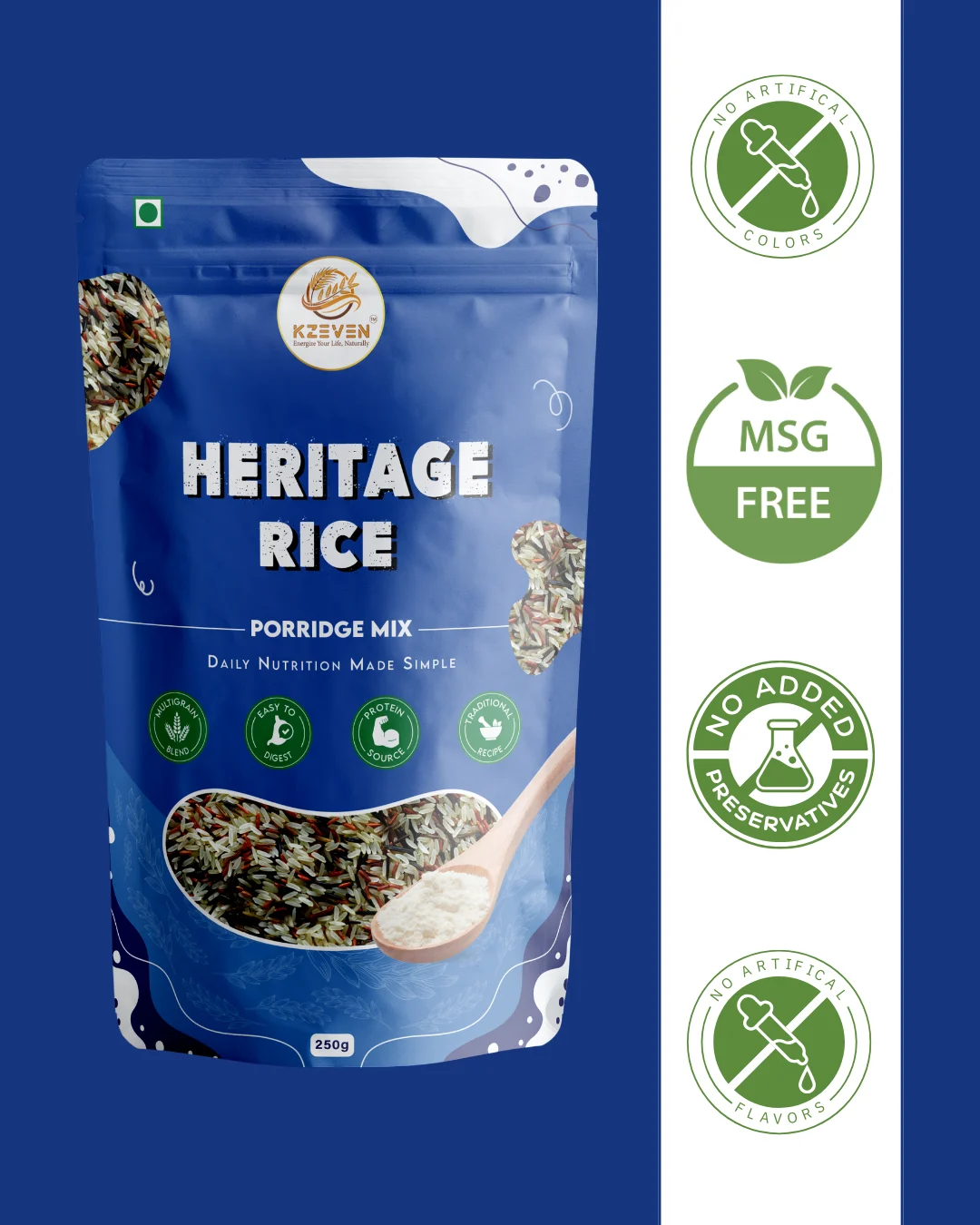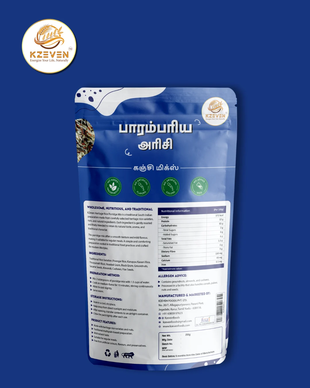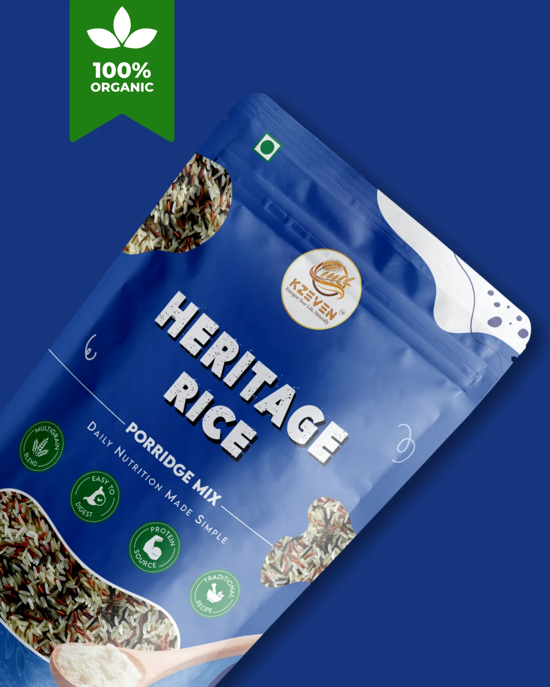 Kzeven Heritage Rice Porridge Mix is a traditional South Indian preparation made from carefully selected heritage rice varieties, nuts, and natural ingredients. Each ingredient is gently roasted and finely blended to retain its natural taste, aroma, and traditional character. This porridge mix offers a smooth texture and mild flavour, making it suitable for regular meals. A simple and comforting preparation rooted in traditional food practices and crafted for modern lifestyles.