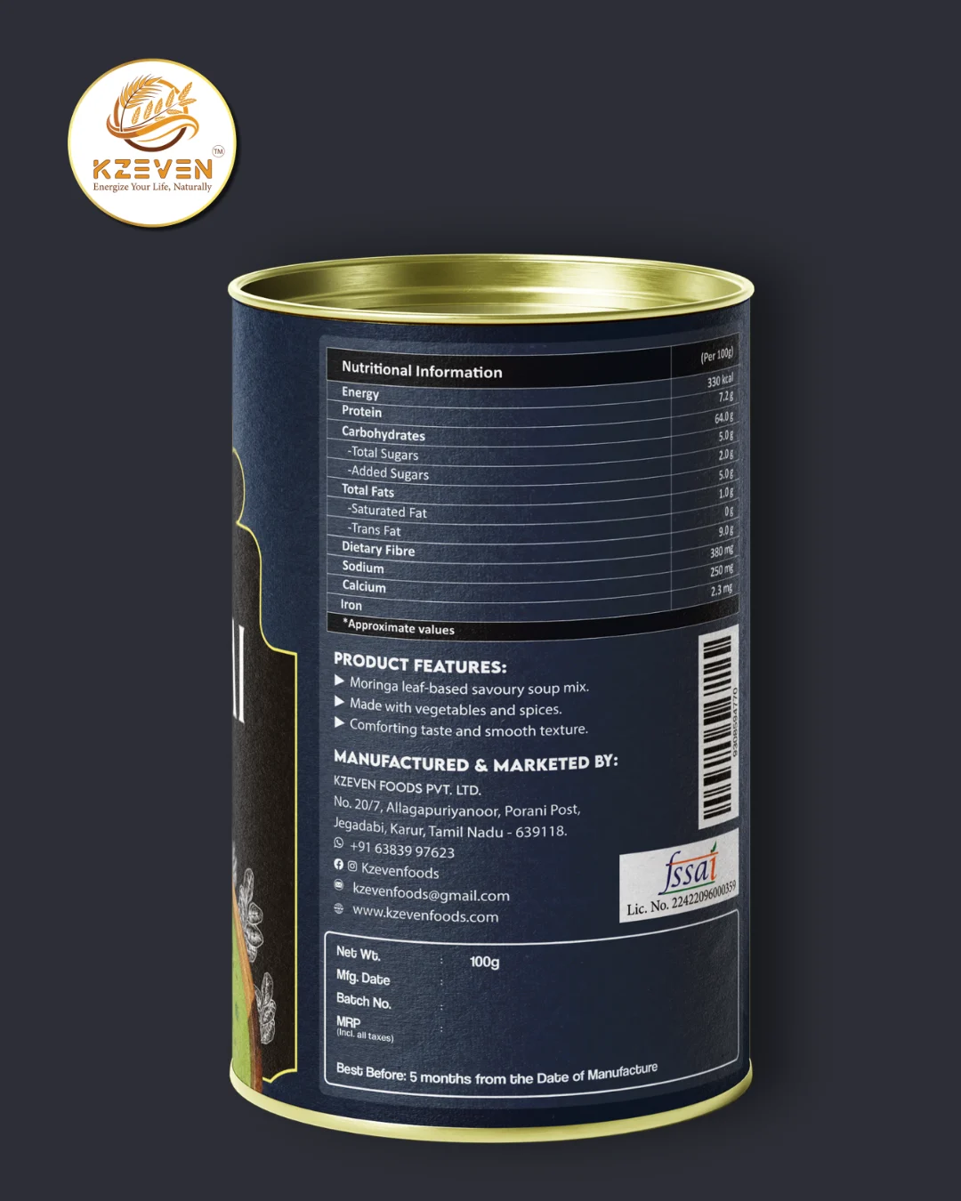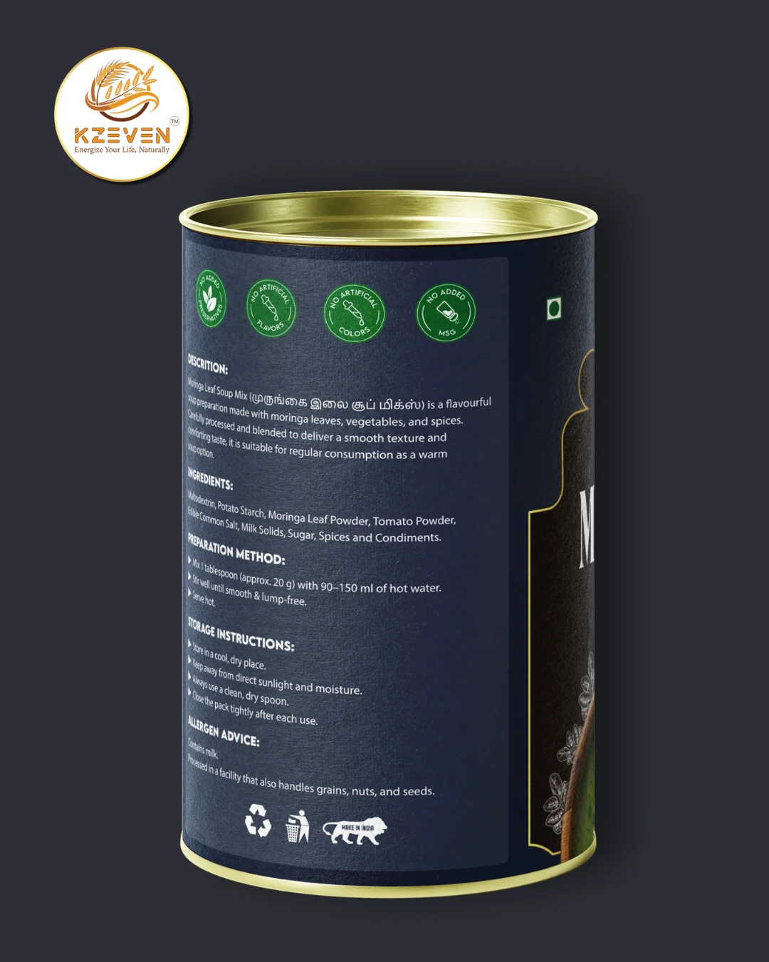 Maltodextrin, Potato Starch, Moringa Leaf Powder, Tomato Powder, Edible Common Salt, Milk Solids, Sugar, Spices and Condiments.