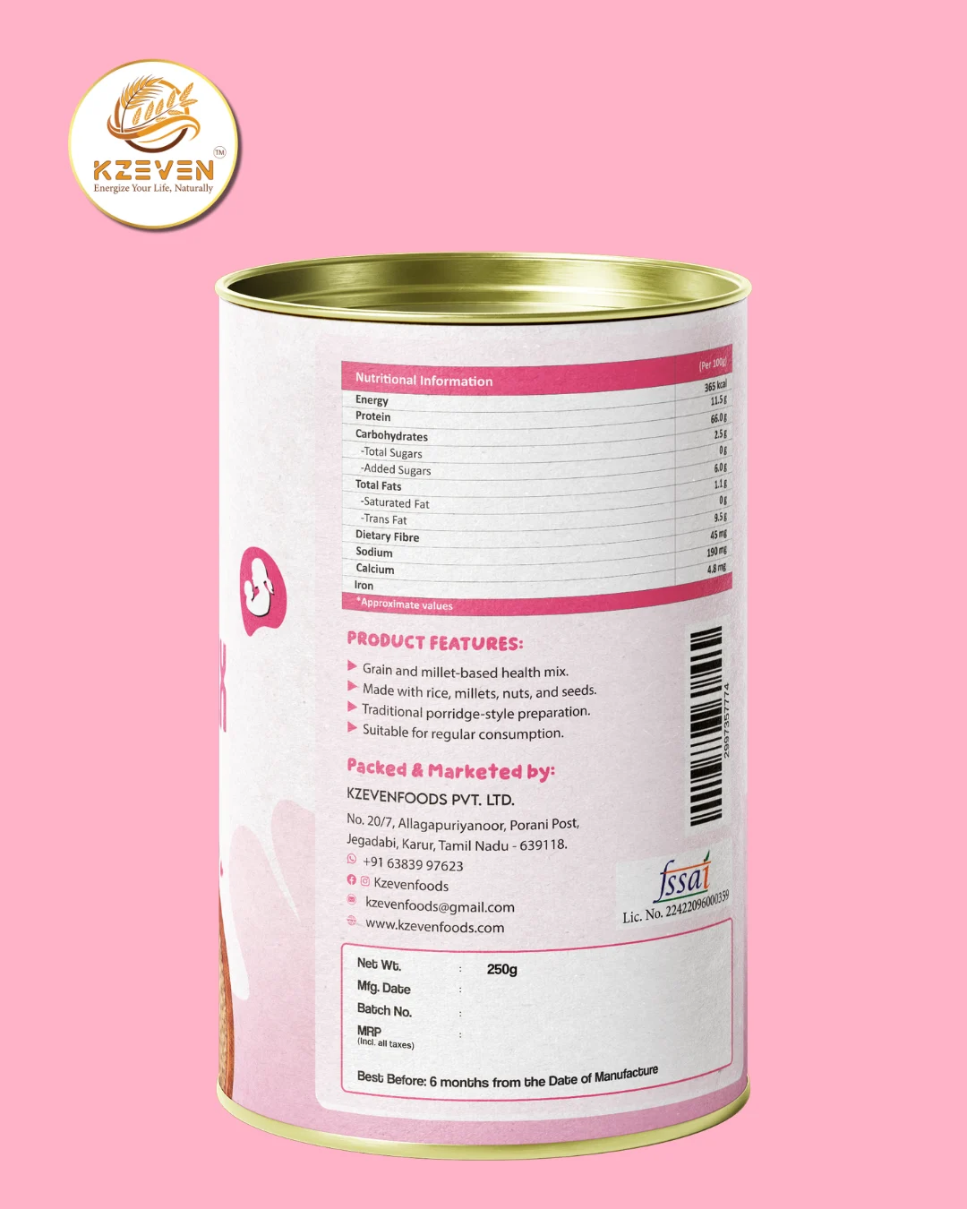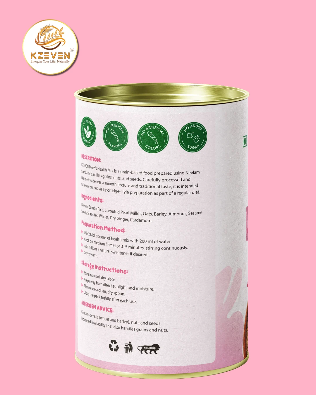 KZEVEN Mom’s Health Mix is a grain-based food prepared using Neelam Samba rice, millets, grains, nuts, and seeds. Carefully processed and blended to deliver a smooth texture and traditional taste, it is intended to be consumed as a porridge-style preparation as part of a regular diet.
