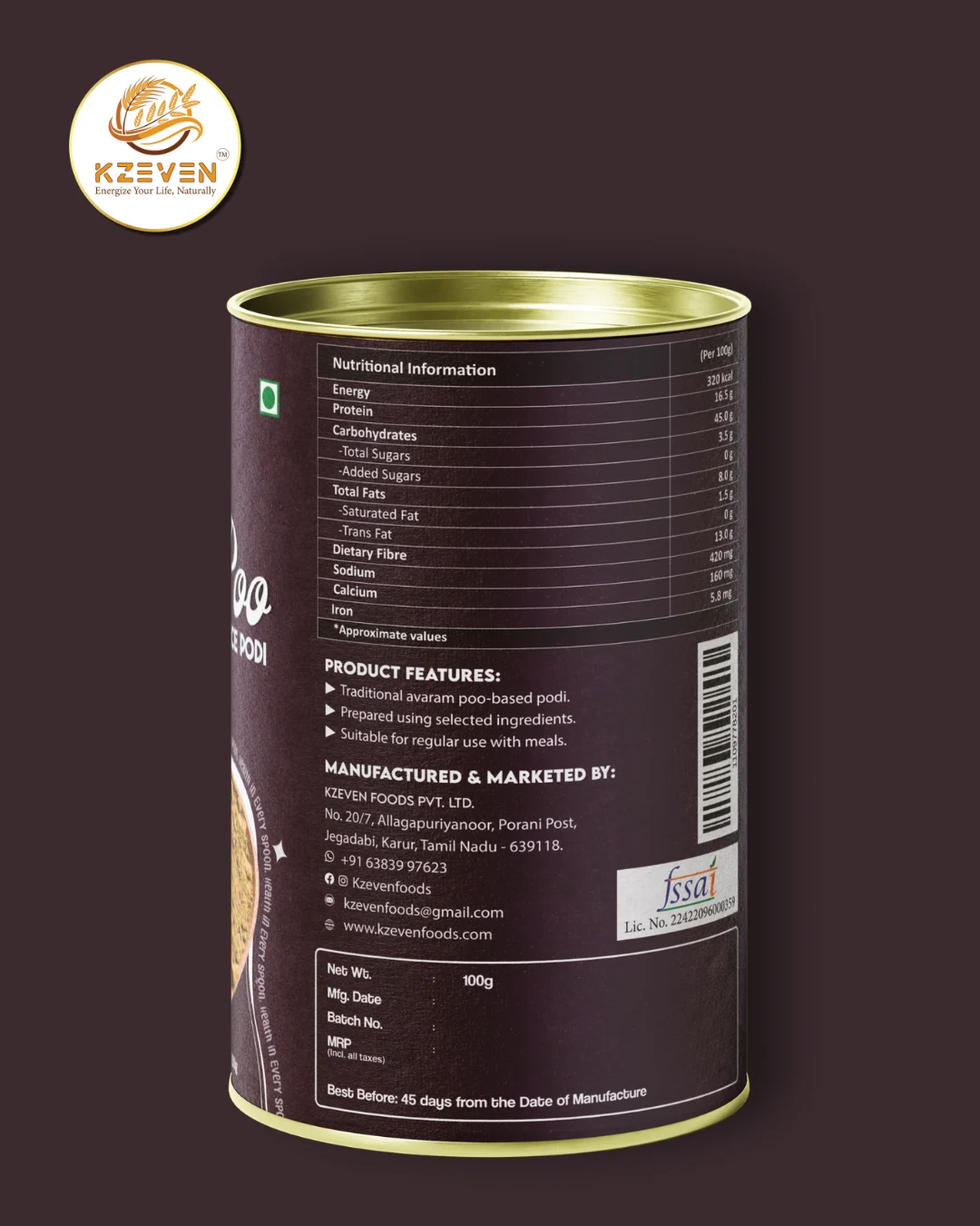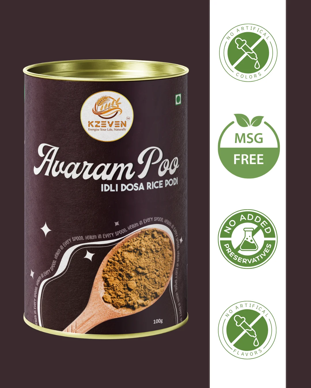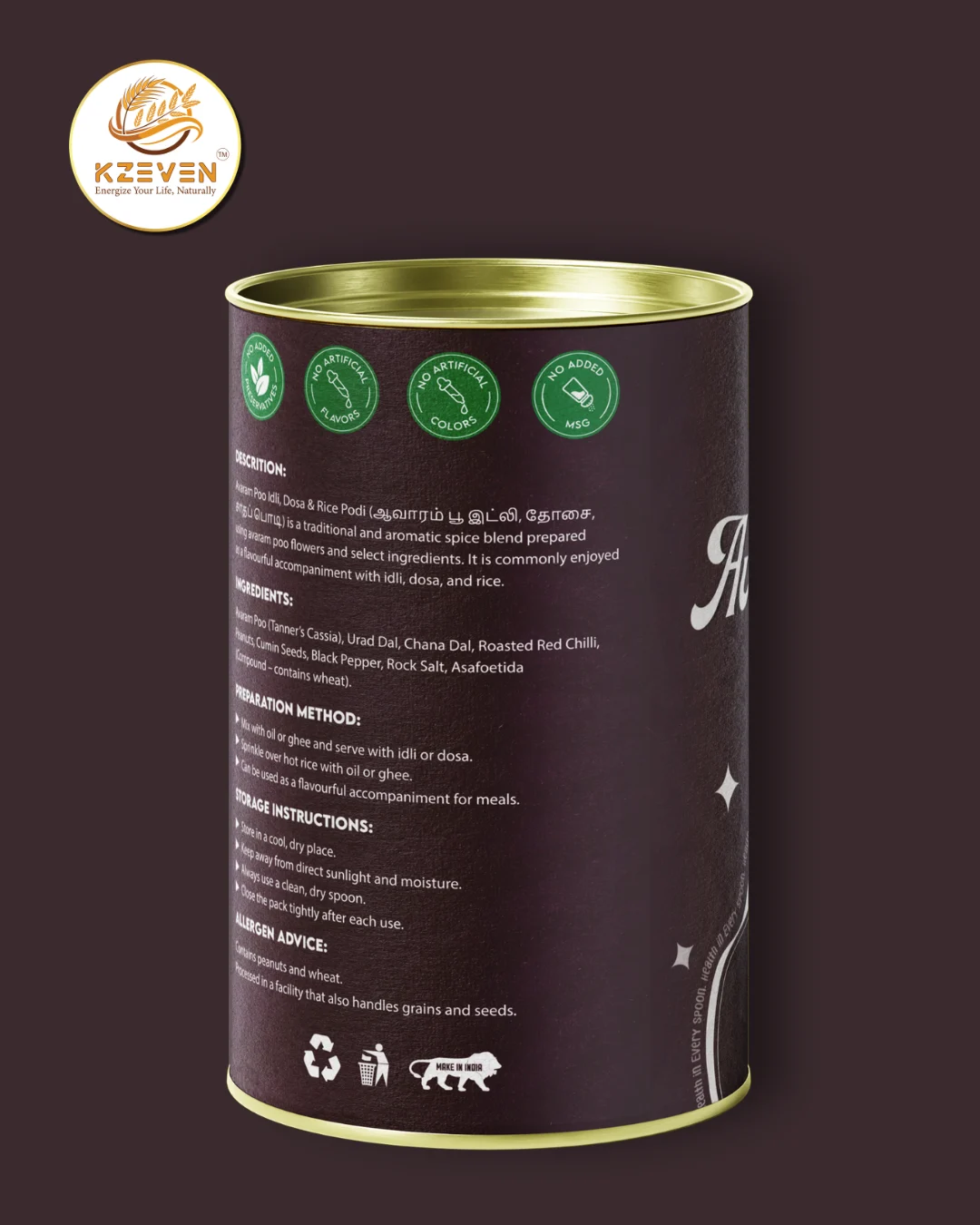 Avaram Poo (Tanner’s Cassia), Urad Dal, Chana Dal, Roasted Red Chilli, Peanuts, Cumin Seeds, Black Pepper, Rock Salt, Asafoetida (Compound – contains wheat).