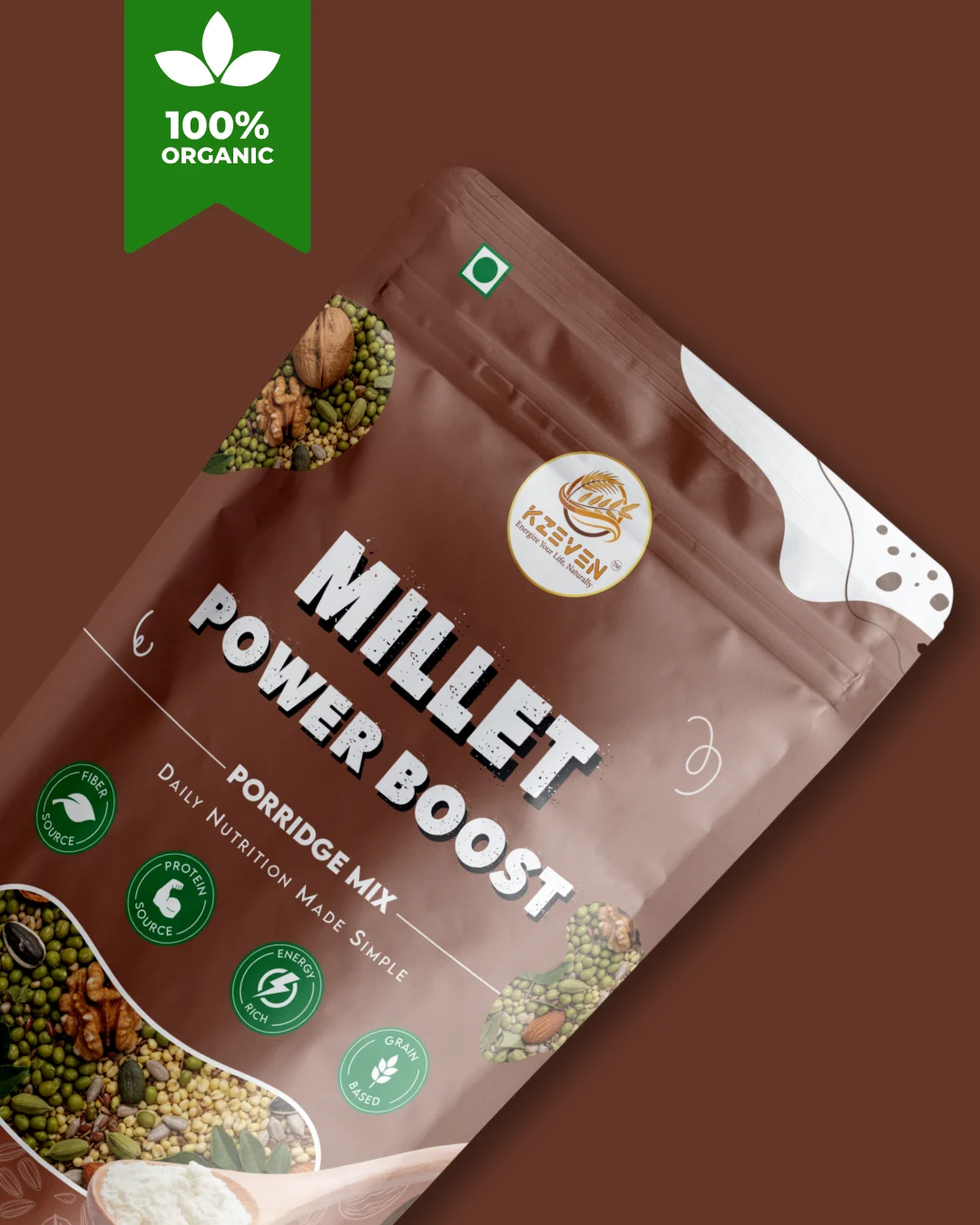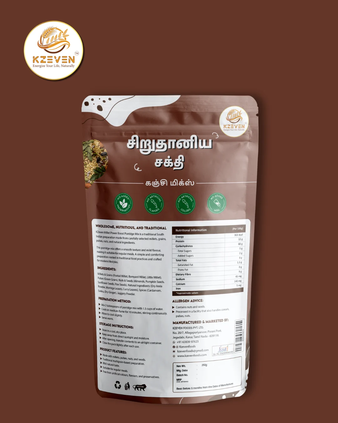 Kzeven Millet Power Boost Porridge Mix (சிறுதானிய சக்தி கஞ்சி மிக்ஸ்) is a traditional South Indian preparation made from carefully selected millets, grains, pulses, nuts, and natural ingredients. This porridge mix offers a smooth texture and mild flavour, making it suitable for regular meals. A simple and comforting preparation rooted in traditional food practices and crafted for modern lifestyles.