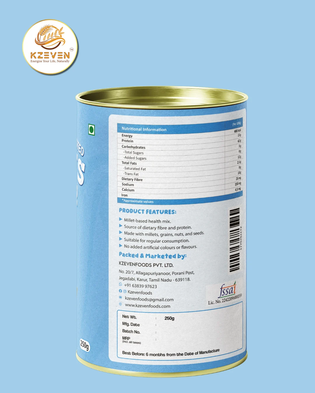 Foxtail Millet, Kodo Millet, Little Millet, Barnyard Millet, Finger Millet (Ragi), Pearl Millet (Bajra), Red Rice, Green Gram, Roasted Gram, Almonds, Cashews, Groundnuts, Pumpkin Seeds, Sunflower Seeds, Flax Seeds, Cardamom, Dry Ginger.