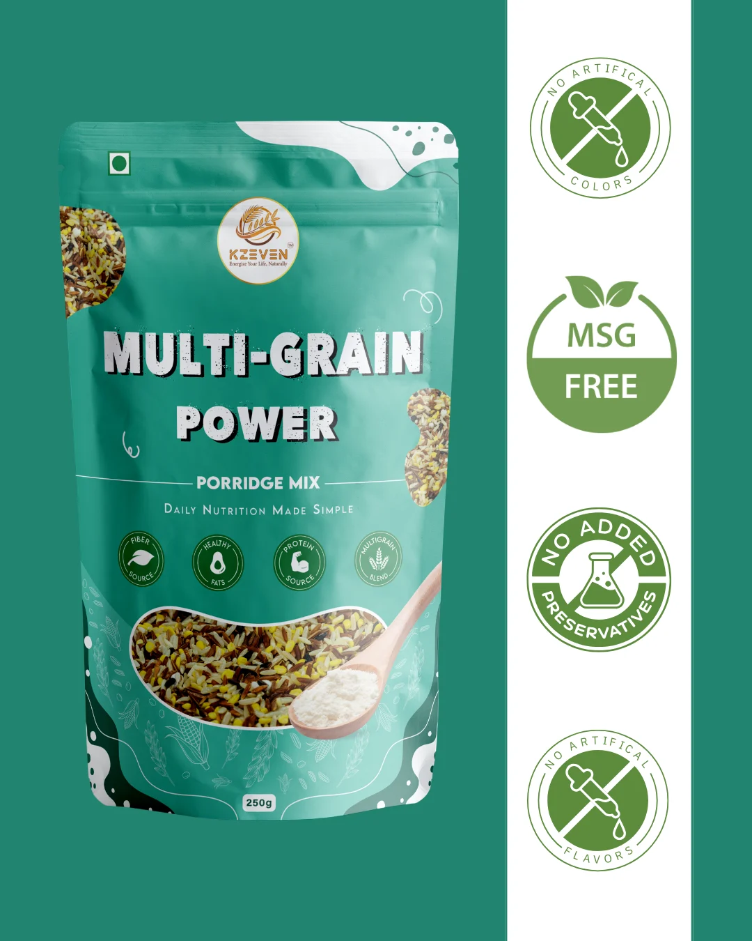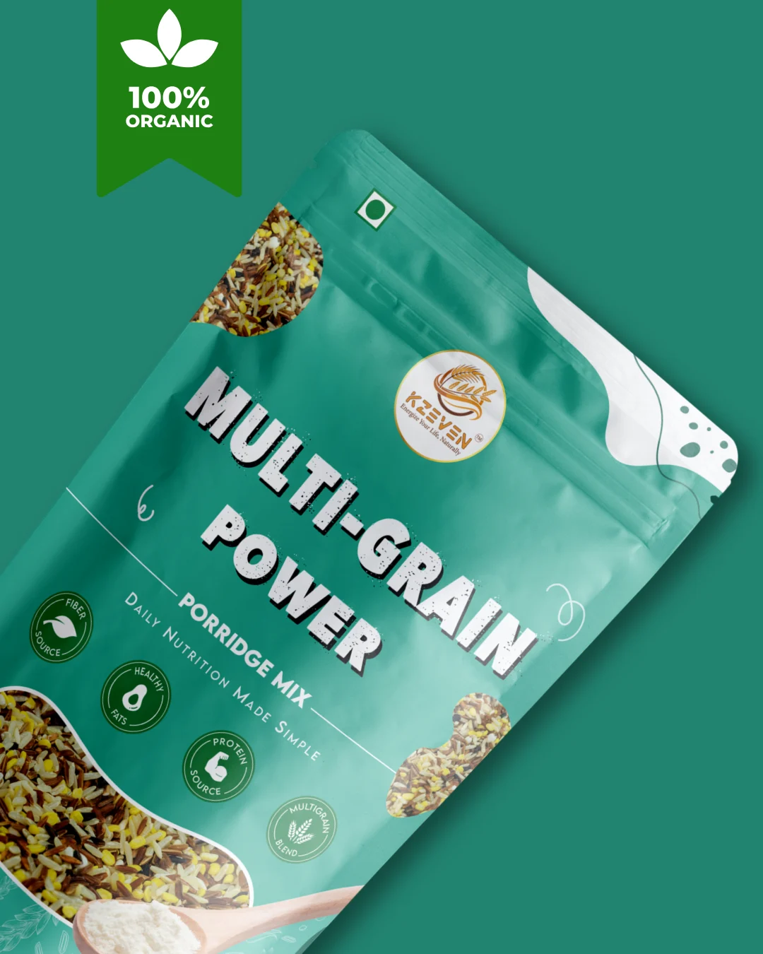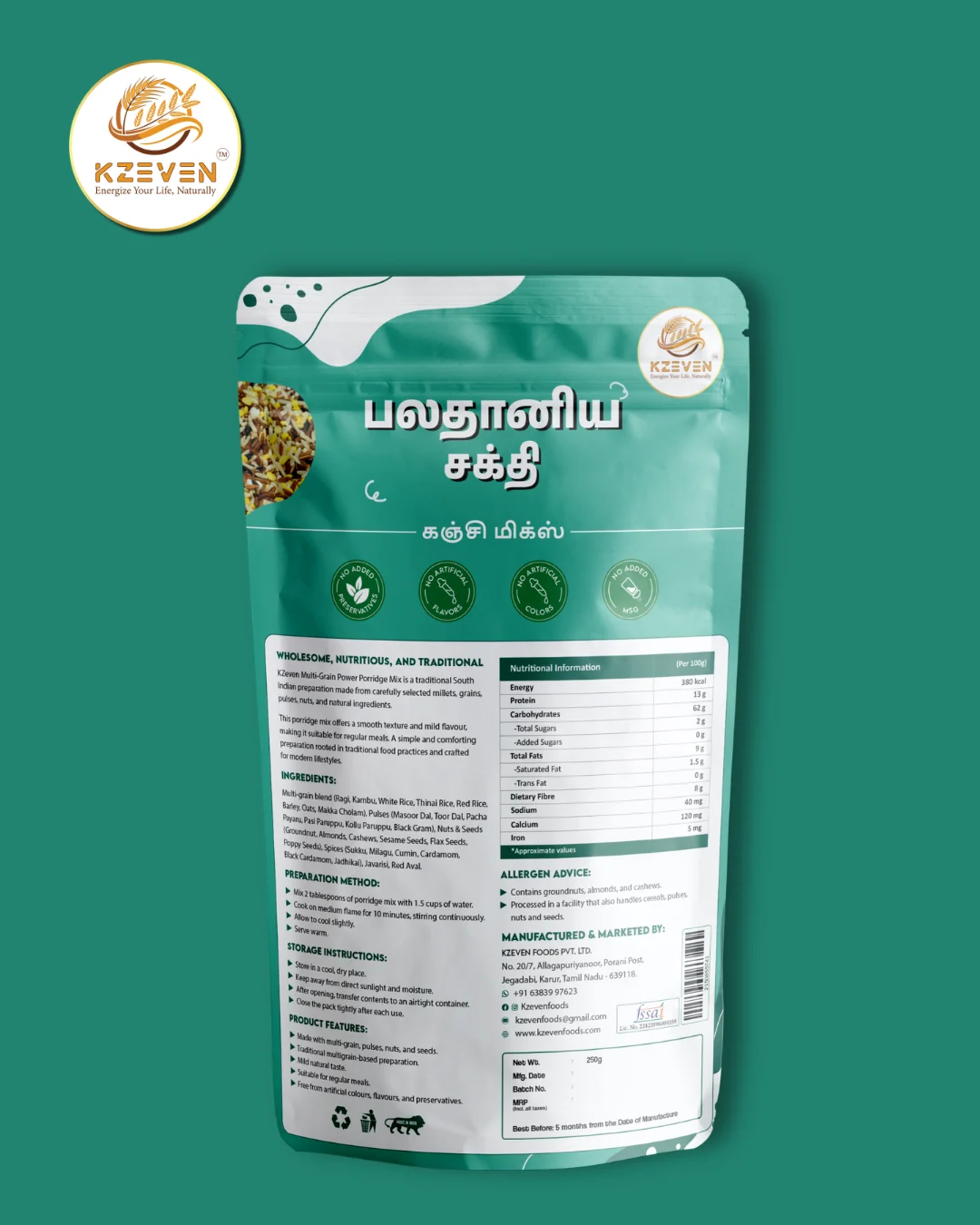 Kzeven Multi-Grain Power Porridge Mix (பலதானிய சக்தி கஞ்சி மிக்ஸ்) is a traditional South Indian preparation made from carefully selected millets, grains, pulses, nuts, and natural ingredients. This porridge mix offers a smooth texture and mild flavour, making it suitable for regular meals. A simple and comforting preparation rooted in traditional food practices and crafted for modern lifestyles.