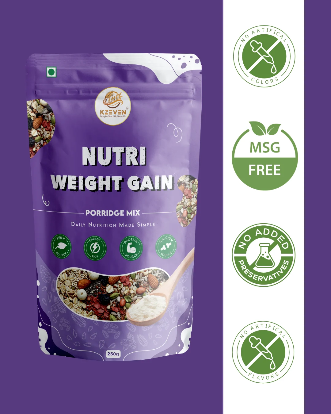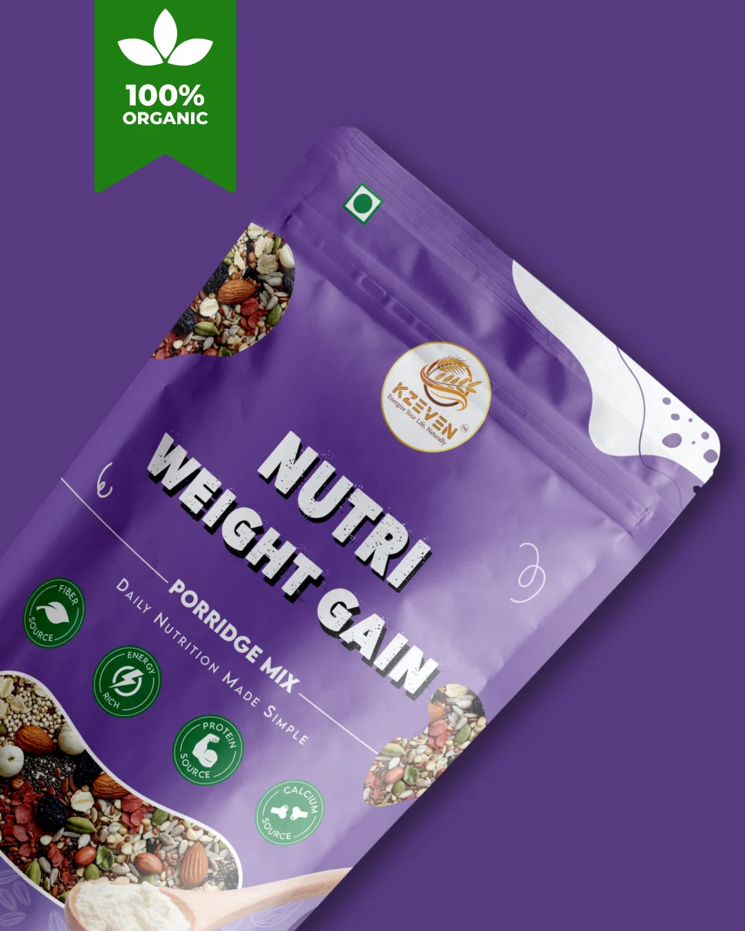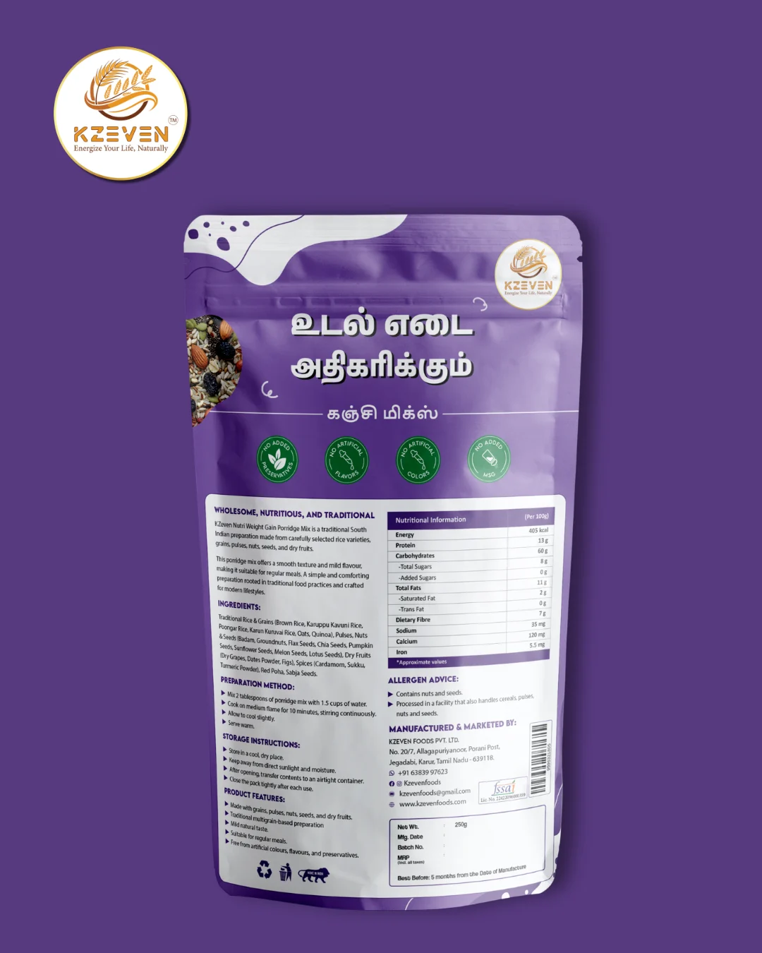 Kzeven Nutri Weight Gain Porridge Mix (உடல் எடை அதிகரிக்கும் கஞ்சி மிக்ஸ்) is a traditional South Indian preparation made from carefully selected rice varieties, grains, pulses, nuts, seeds, and dry fruits. This porridge mix offers a smooth texture and mild flavour, making it suitable for regular meals. A simple and comforting preparation rooted in traditional food practices and crafted for modern lifestyles.