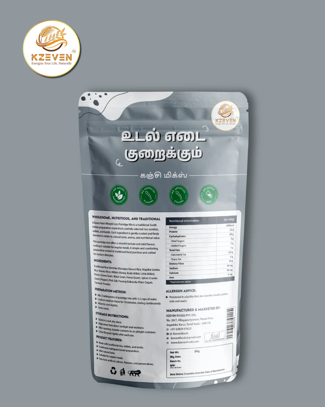 Kzeven Nutri Weight Loss Porridge Mix (உடல் எடை குறைக்கும் கஞ்சி மிக்ஸ்) is a traditional South Indian preparation made from carefully selected rice varieties, millets, and lentils. Each ingredient is gently roasted and finely blended to retain its natural taste, aroma, and nutritional value. This porridge mix offers a smooth texture and mild flavour, making it suitable for regular meals. A simple and comforting preparation rooted in traditional food practices and crafted for modern lifestyles.
