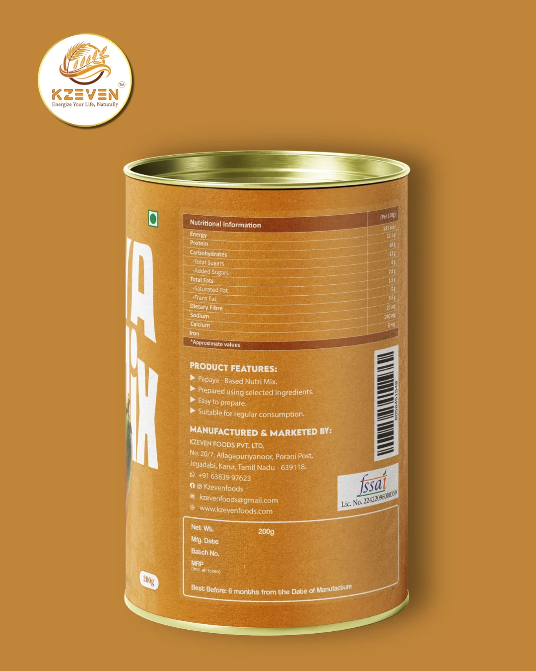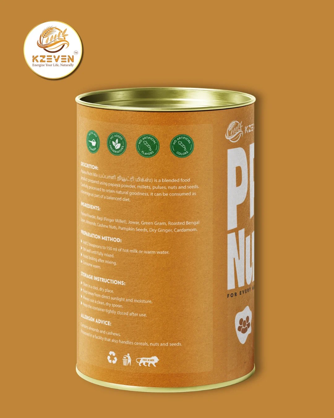 Papaya Nutri Mix (பப்பாளி நியூட்ரி மிக்ஸ்) is a blended food product prepared using papaya powder, millets, pulses, nuts and seeds. Carefully processed to retain natural goodness, it can be consumed as a beverage as part of a balanced diet.