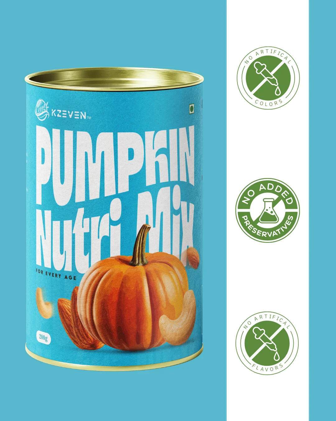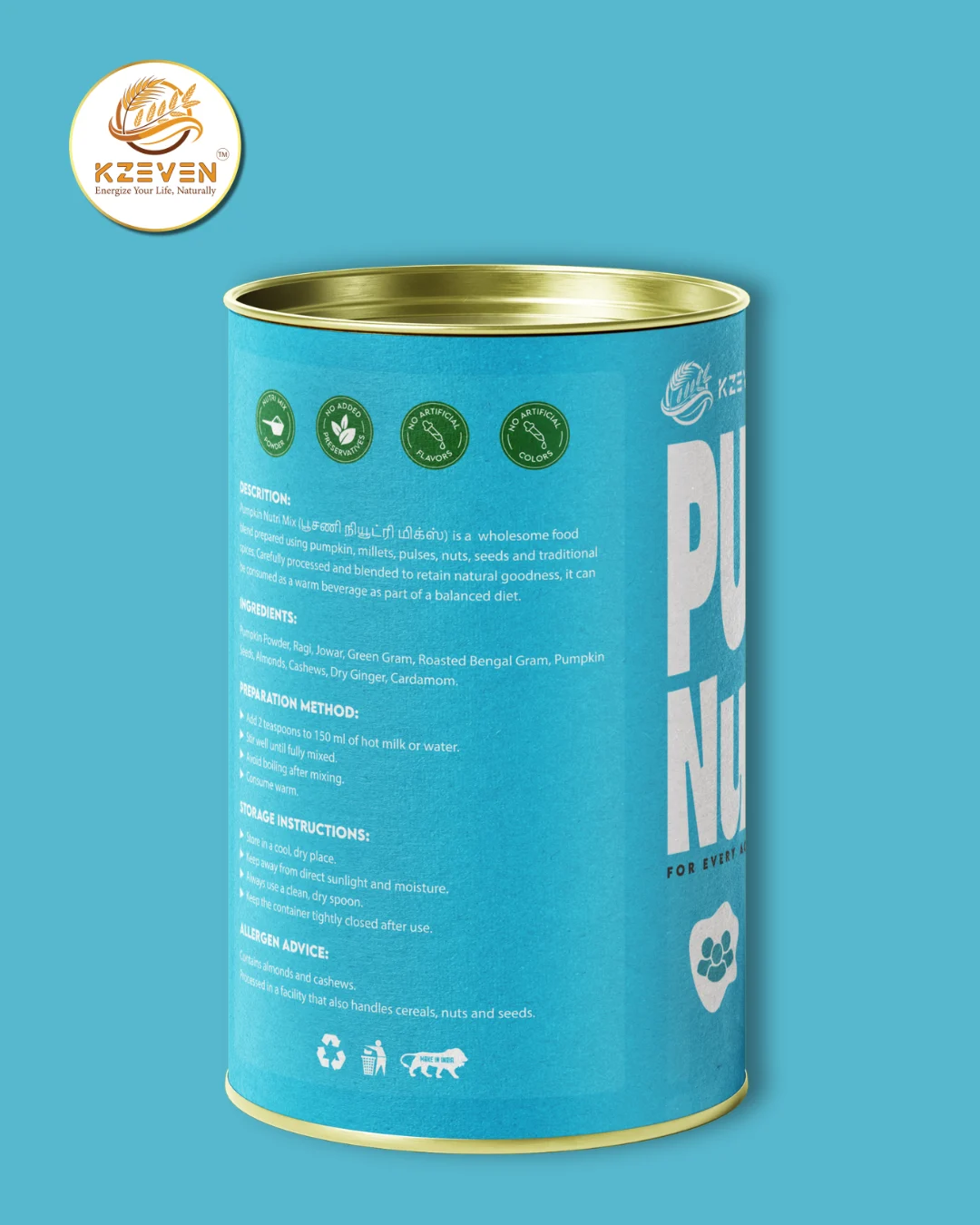 Pumpkin Powder, Ragi, Jowar, Green Gram, Roasted Bengal Gram, Pumpkin Seeds, Almonds, Cashews, Dry Ginger, Cardamom.